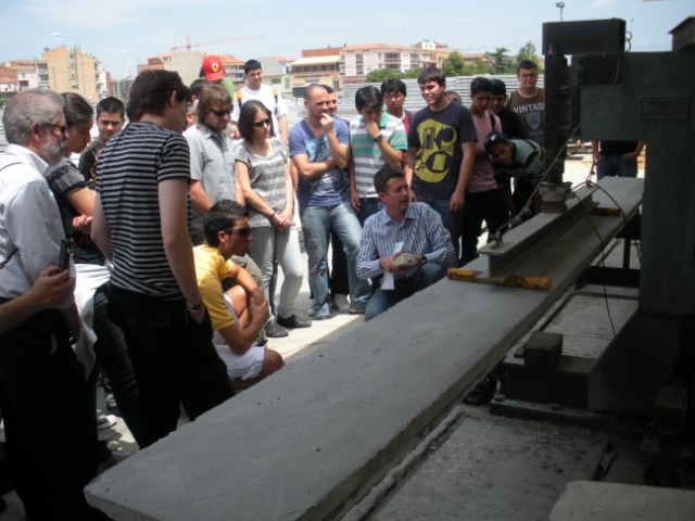 Es van poder veure las instal·lacions per a la fabricació d’elements pretensats per a obra civil com són les bigues pont. També la dedicada a plaques alveolars i la de biguetes, en la qual es va poder seguir l’assaig de trencament a flexió que es fa diariament dins del seu programa de control de qualitat. Les imatges adjuntes fan referència a aquest moment de la visita.
