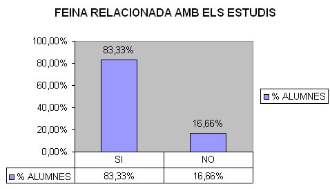 Un altre índex de qualitat de la formació és la proporció d'alumnat que treballa en un lloc de treball relacionat amb la seva professió, és a dir, amb la formació rebuda al nostre centre. També en aquest cas trobem que quasi el 85% dels alumnes treballen en la seva professió.